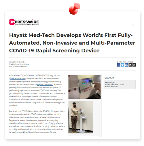 NEW YORK CITY, NEW YORK, UNITED STATES, May 28, 2021 /EINPresswire.com/ -- Hayatt Med-Tech, an innovative and disruptive startup in the medical technology industry, today announced the development of Hayatt Thermox-D, a patent-pending fully-automated state-of-the-art device capable of performing rapid multi-parameter COVID-19 screening. This groundbreaking device provides communities and businesses a novel solution to mitigate the risk of infectious disease transmission, allowing them to more safely resume in-person activities and combat the progression of this devastating global pandemic.