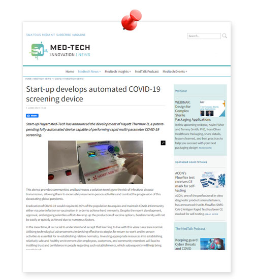 Start-up Hayatt Med-Tech has announced the development of Hayatt Thermox-D, a patent-pending fully-automated device capable of performing rapid multi-parameter COVID-19 screening.